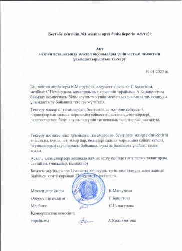 АКТ проверки организации горячего питания для школьников в школьной столовой